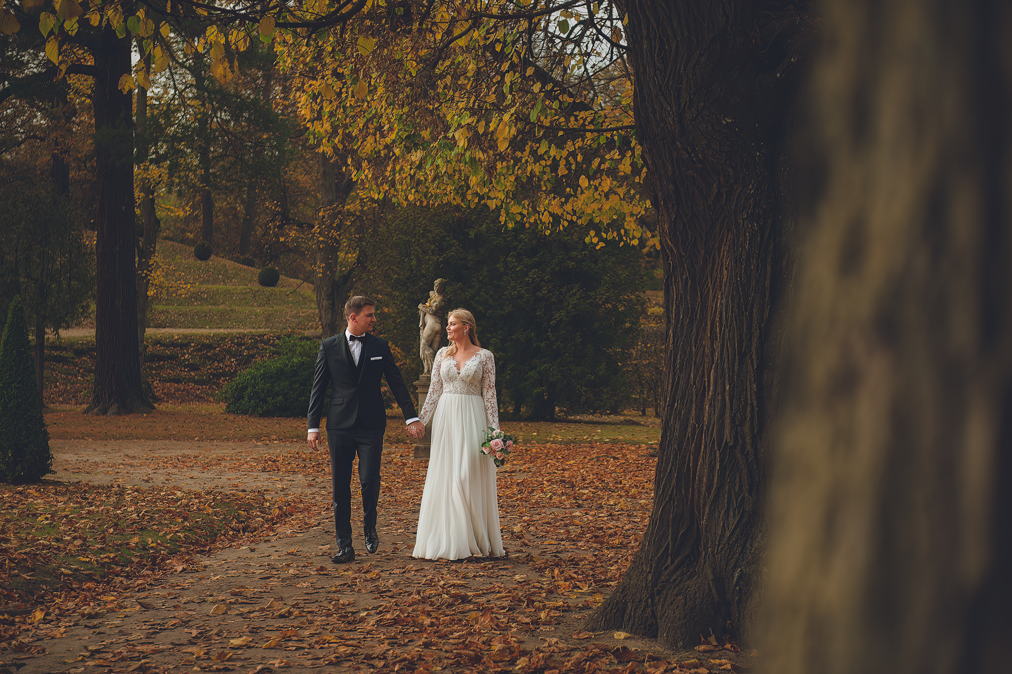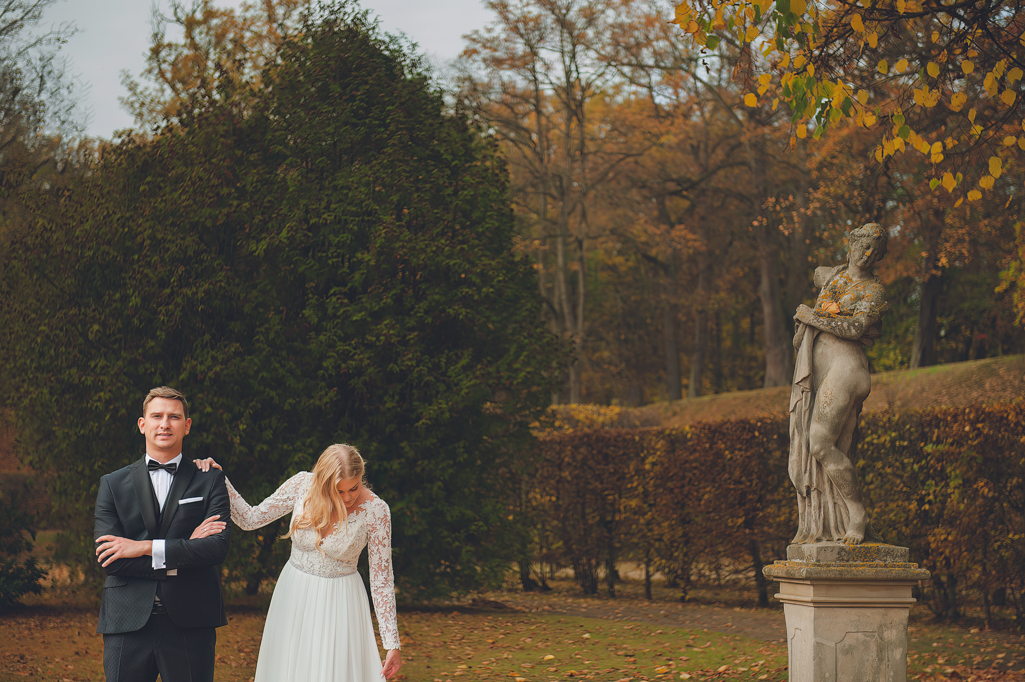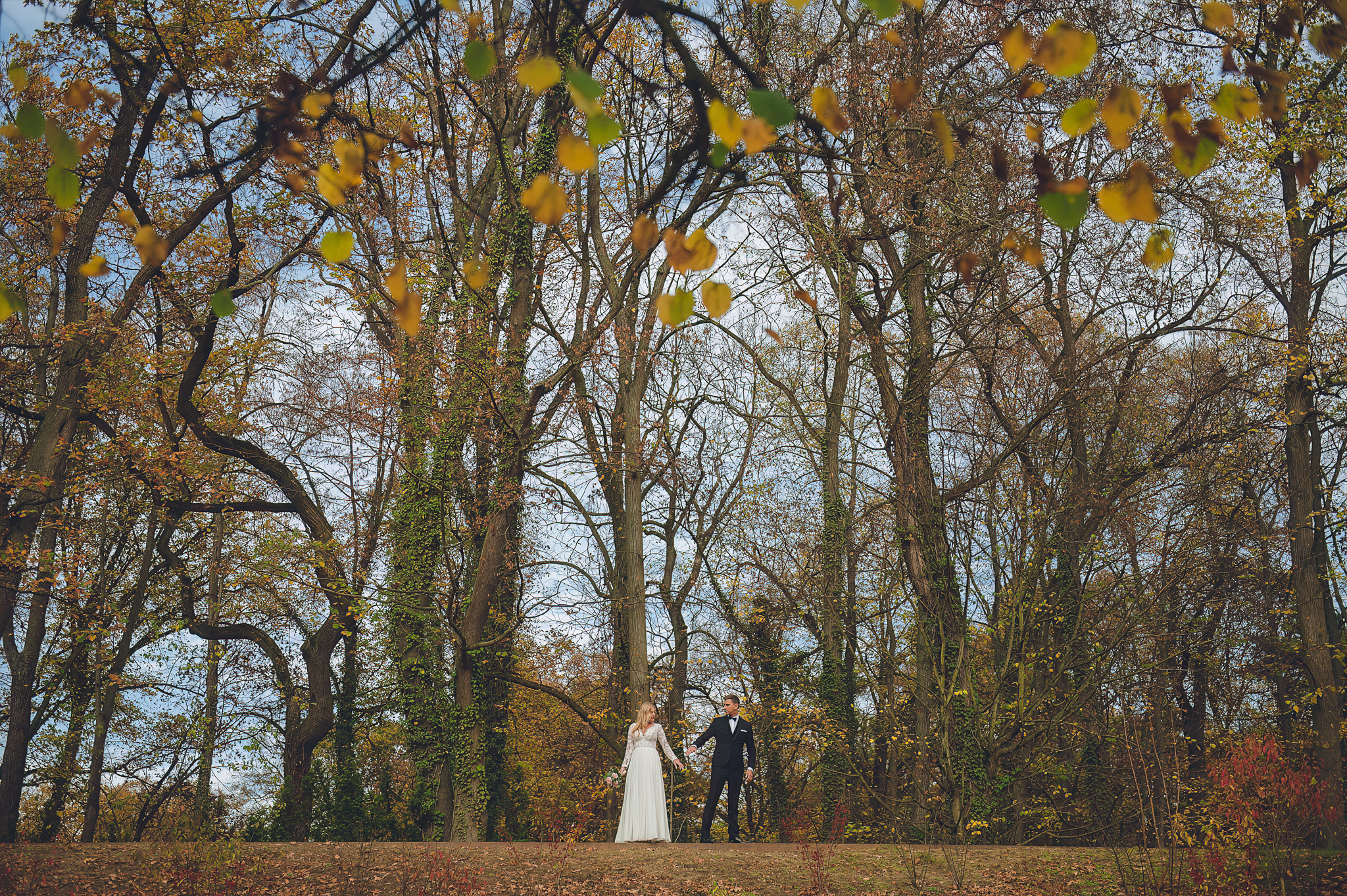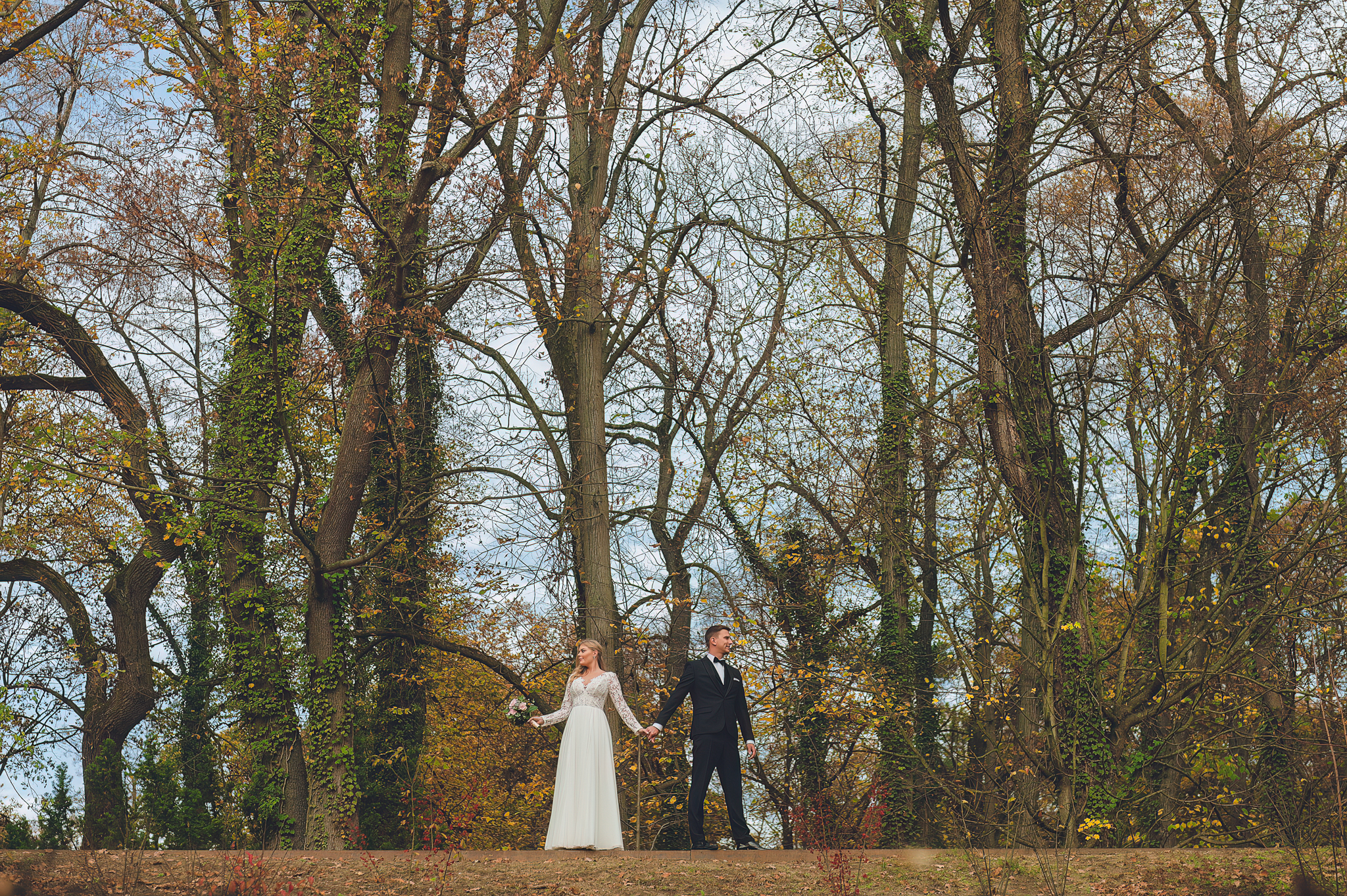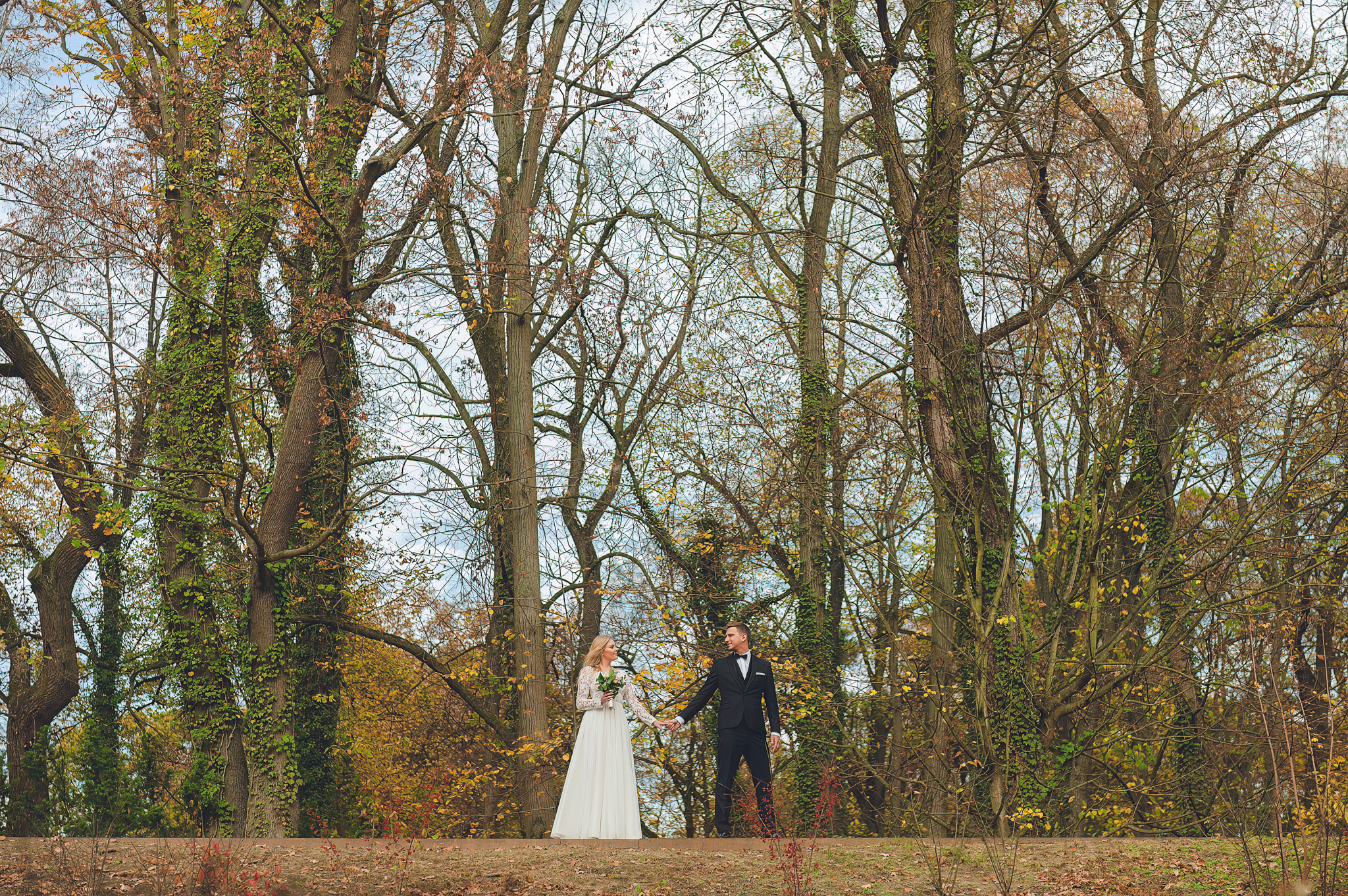 NAPISZ DO NAS →Jesień to najtrudniejsza i najpiękniejsza pora dla fotografa. U Agaty i Michała światło było gęste, złote i nisko zawieszone. Wykorzystaliśmy to, by zbudować klimat "Szlachetnej Ciszy". Ceglane mury kościoła i rudości w parku stworzyły naturalne, ciepłe tło, które idealnie kontrastowało z czernią garnituru i bielą sukni.