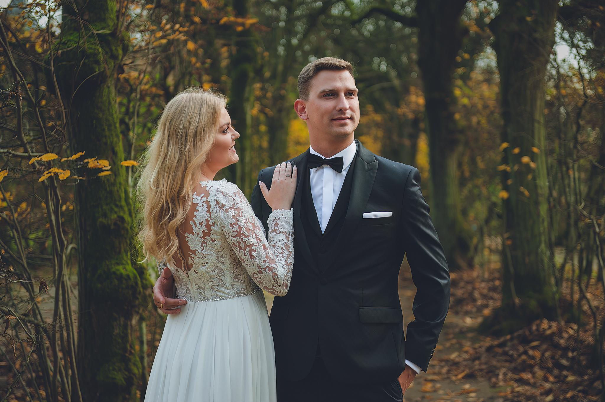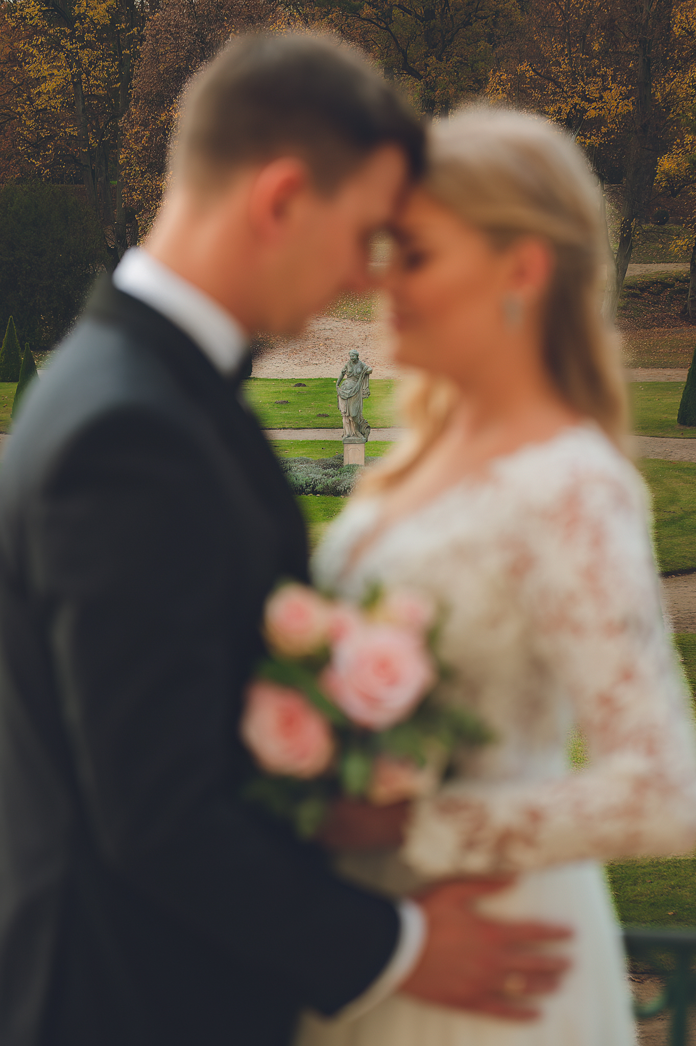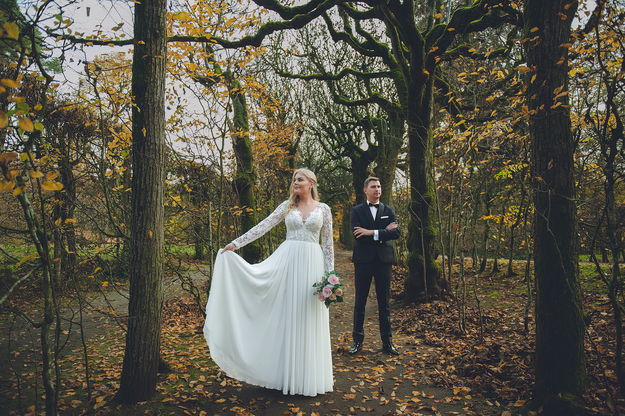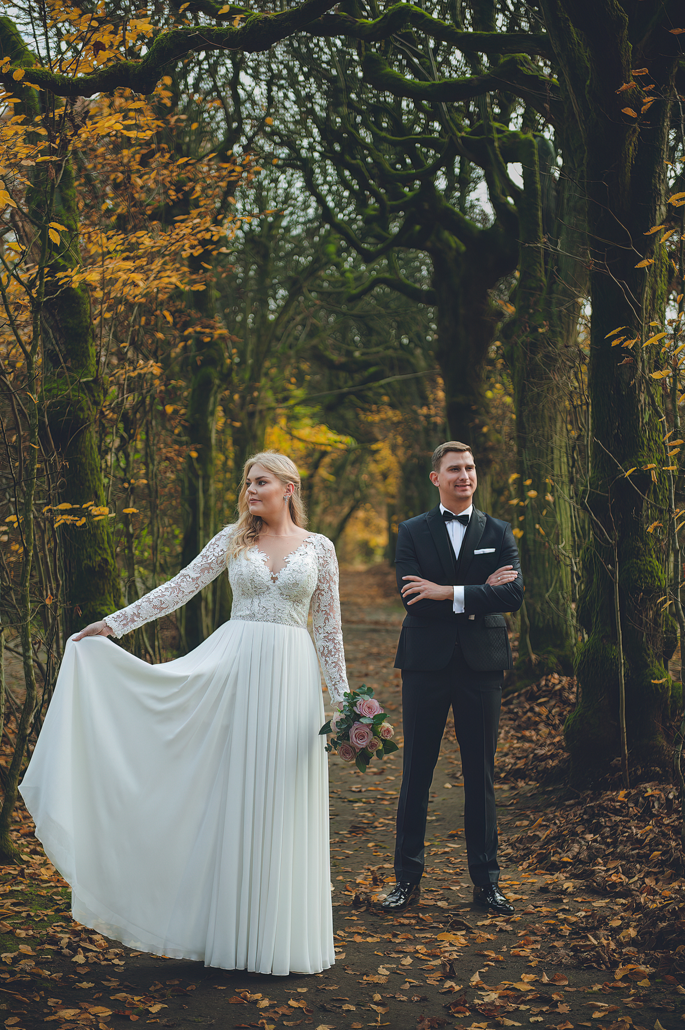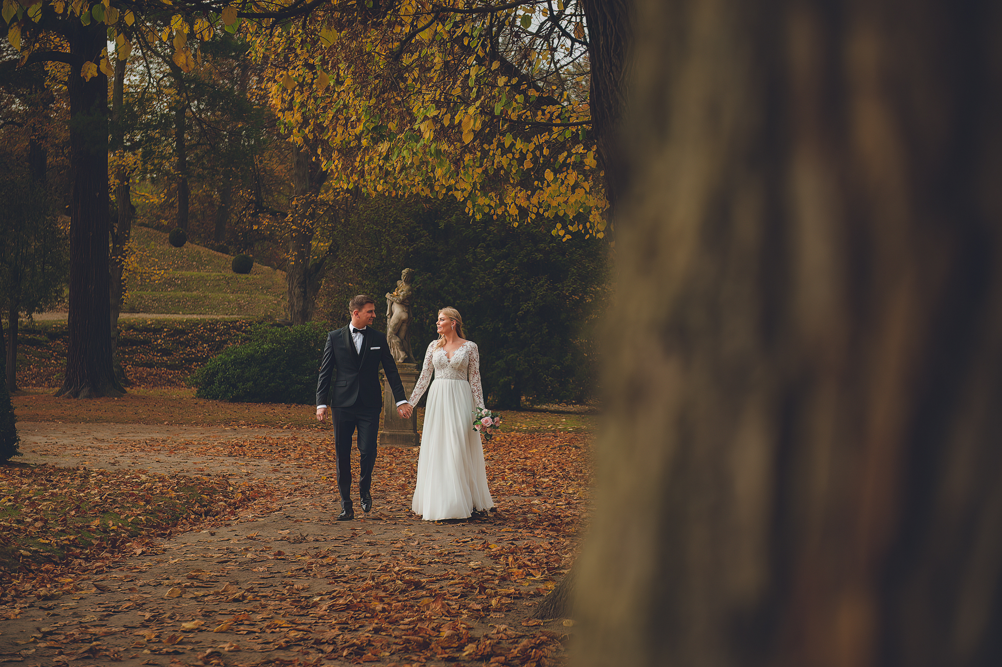 NAPISZ DO NAS →Jesień to najtrudniejsza i najpiękniejsza pora dla fotografa. U Agaty i Michała światło było gęste, złote i nisko zawieszone. Wykorzystaliśmy to, by zbudować klimat "Szlachetnej Ciszy". Ceglane mury kościoła i rudości w parku stworzyły naturalne, ciepłe tło, które idealnie kontrastowało z czernią garnituru i bielą sukni.