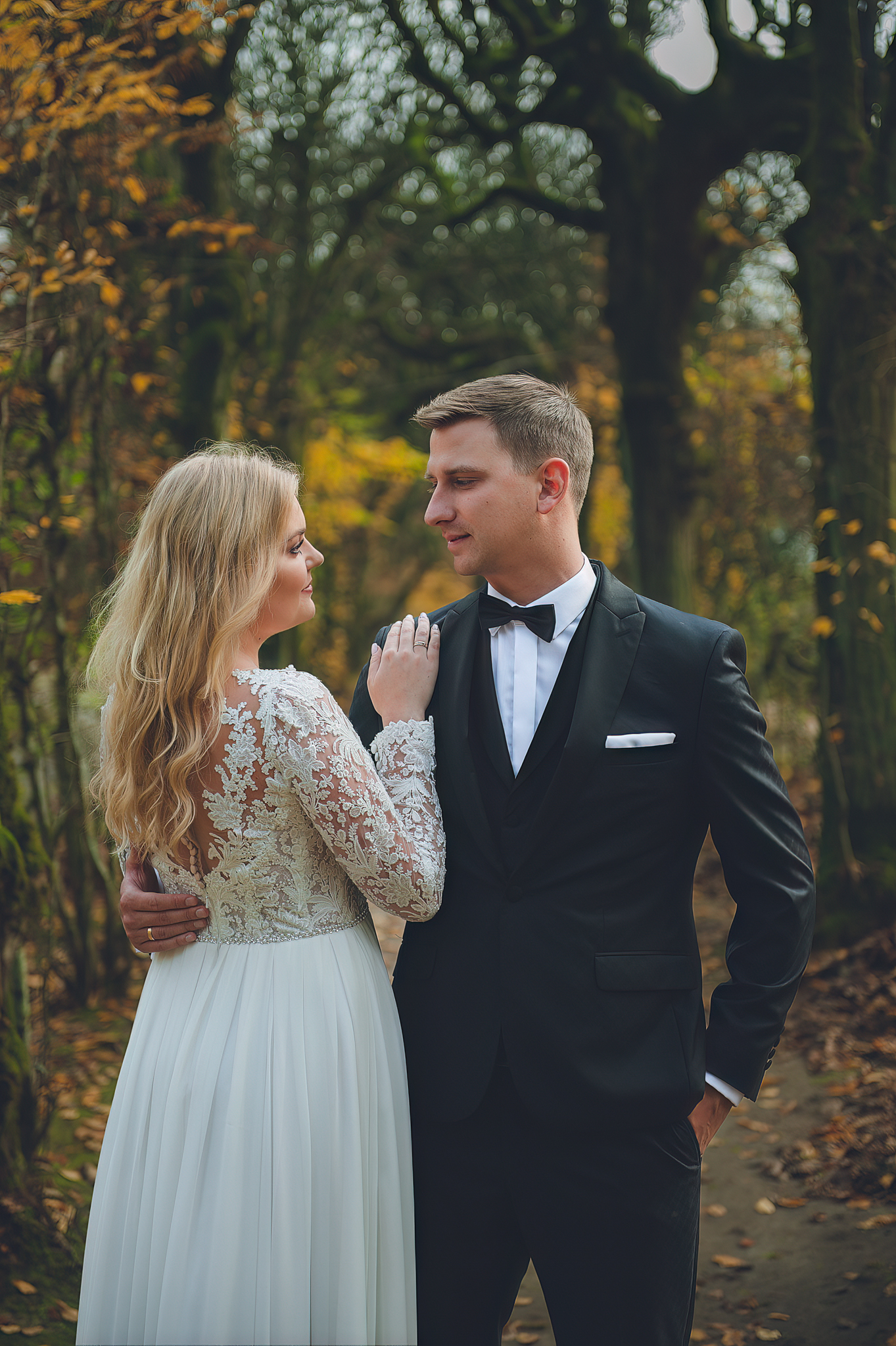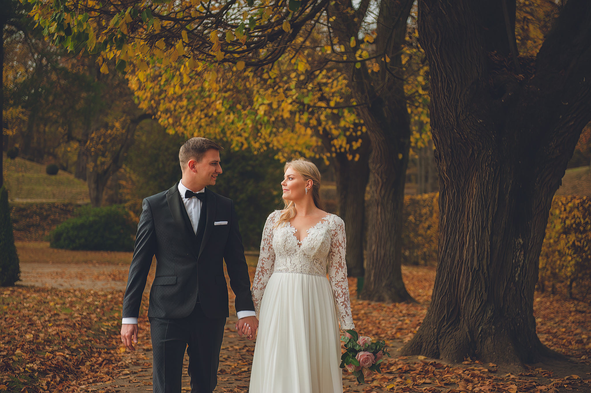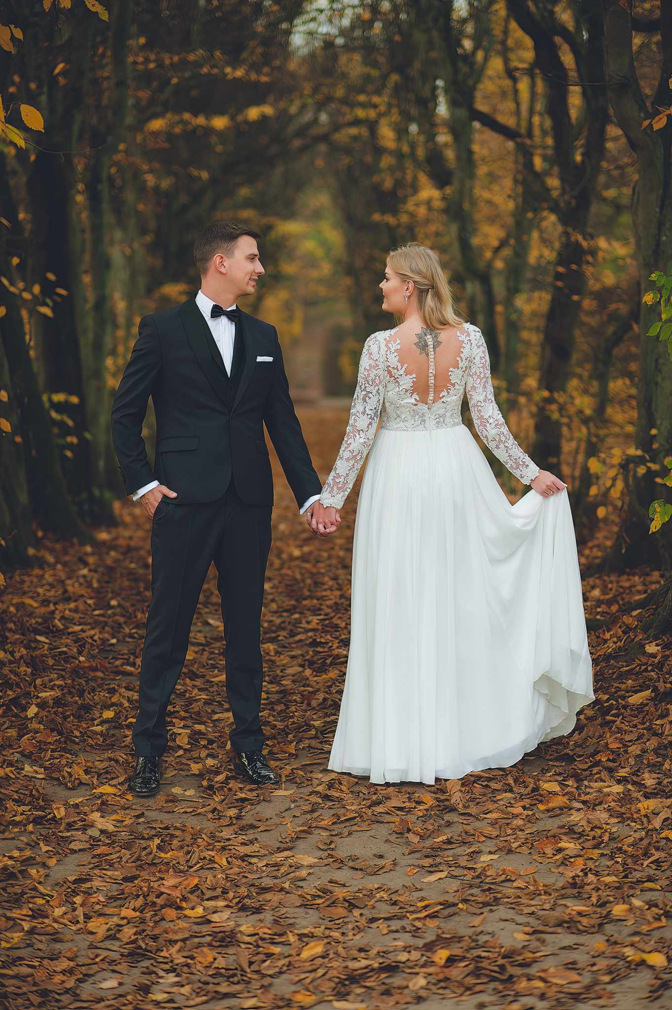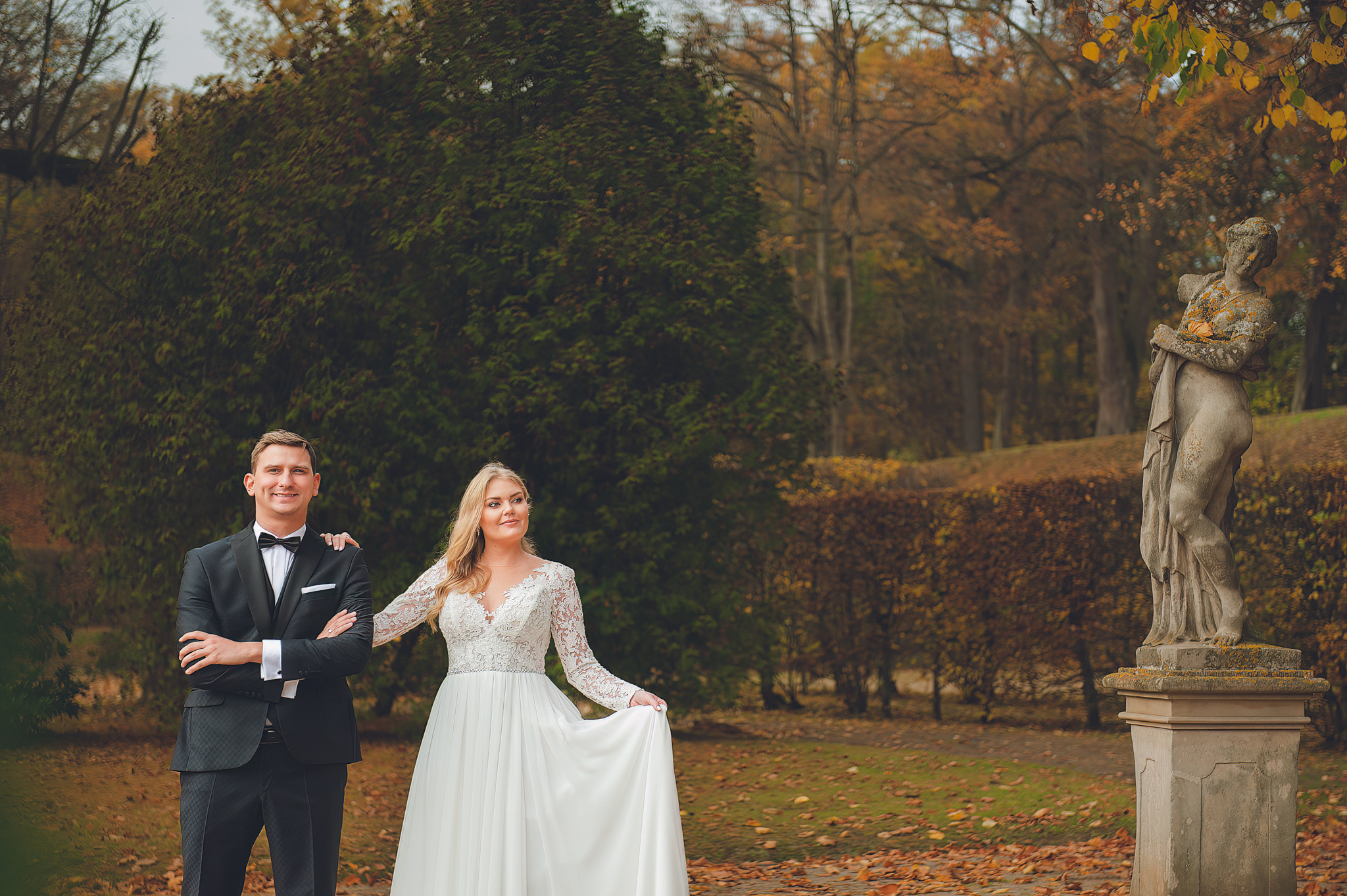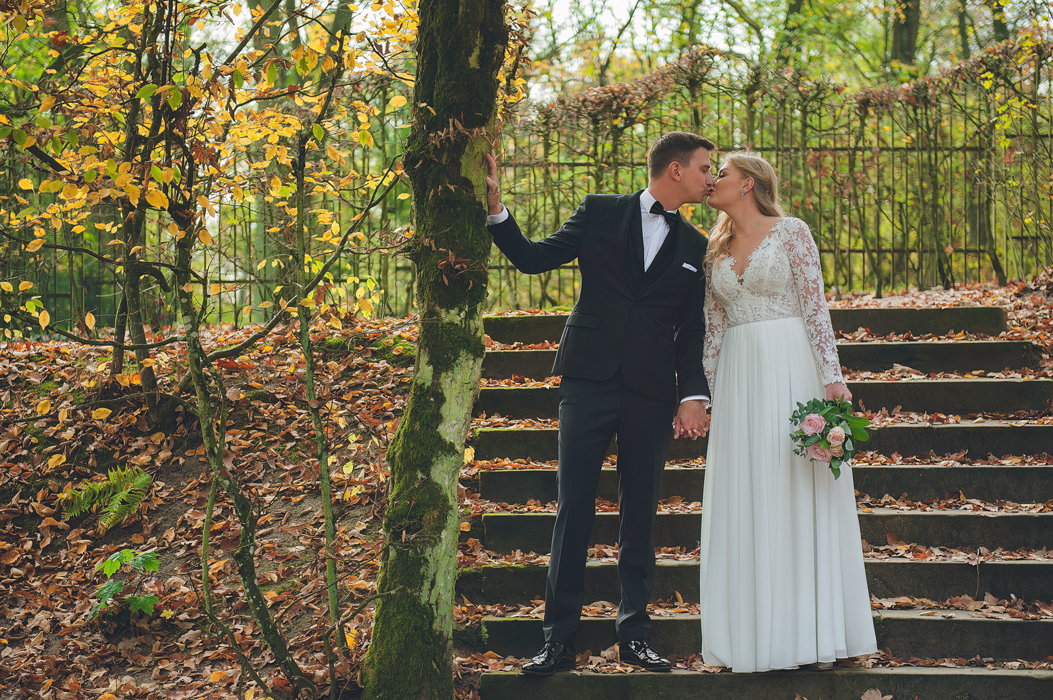 NAPISZ DO NAS →Jesień to najtrudniejsza i najpiękniejsza pora dla fotografa. U Agaty i Michała światło było gęste, złote i nisko zawieszone. Wykorzystaliśmy to, by zbudować klimat "Szlachetnej Ciszy". Ceglane mury kościoła i rudości w parku stworzyły naturalne, ciepłe tło, które idealnie kontrastowało z czernią garnituru i bielą sukni.