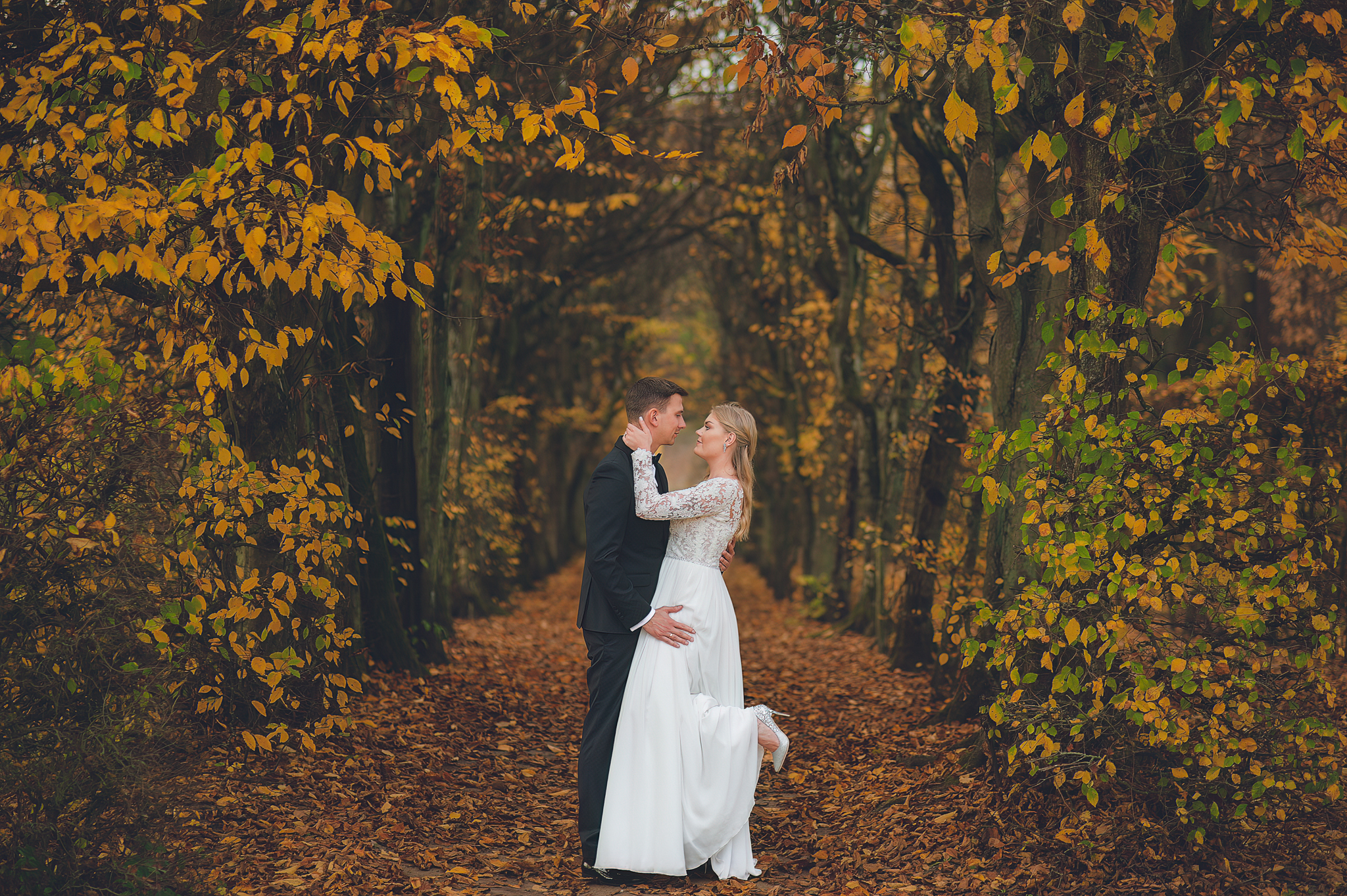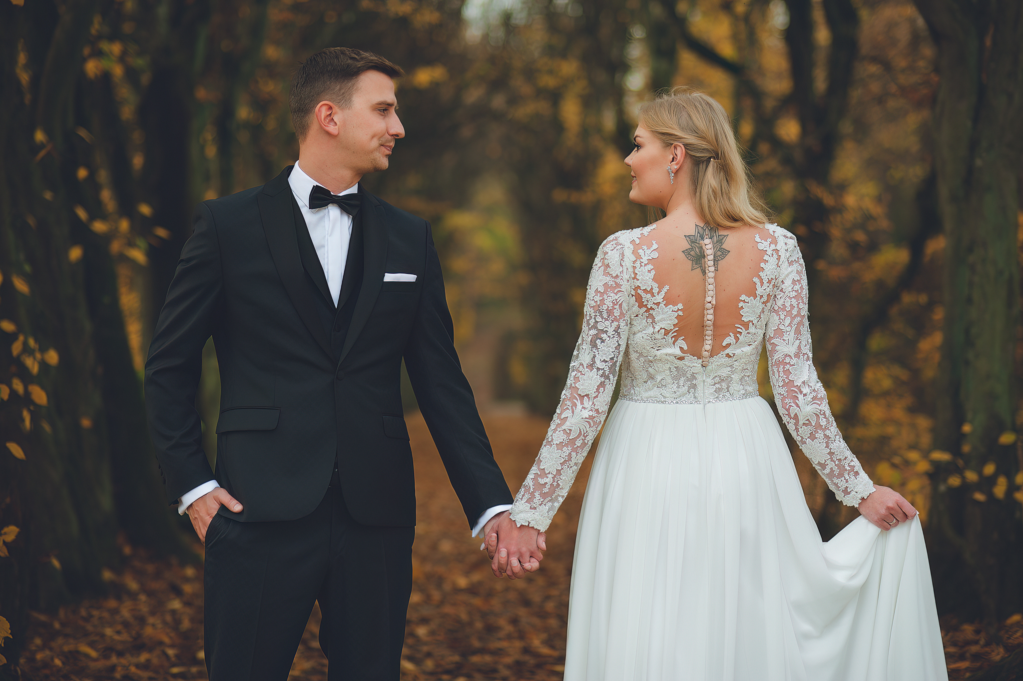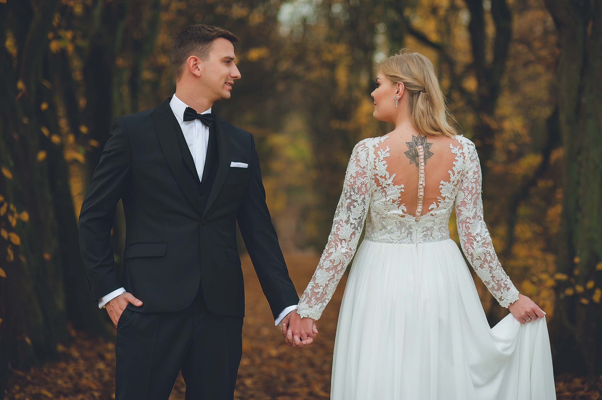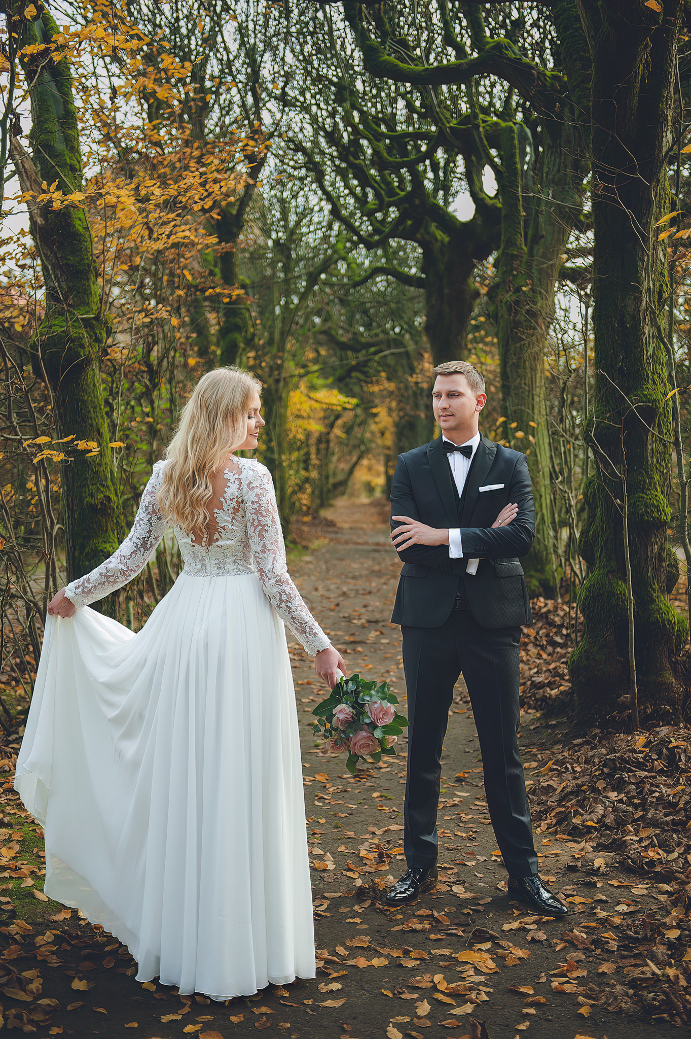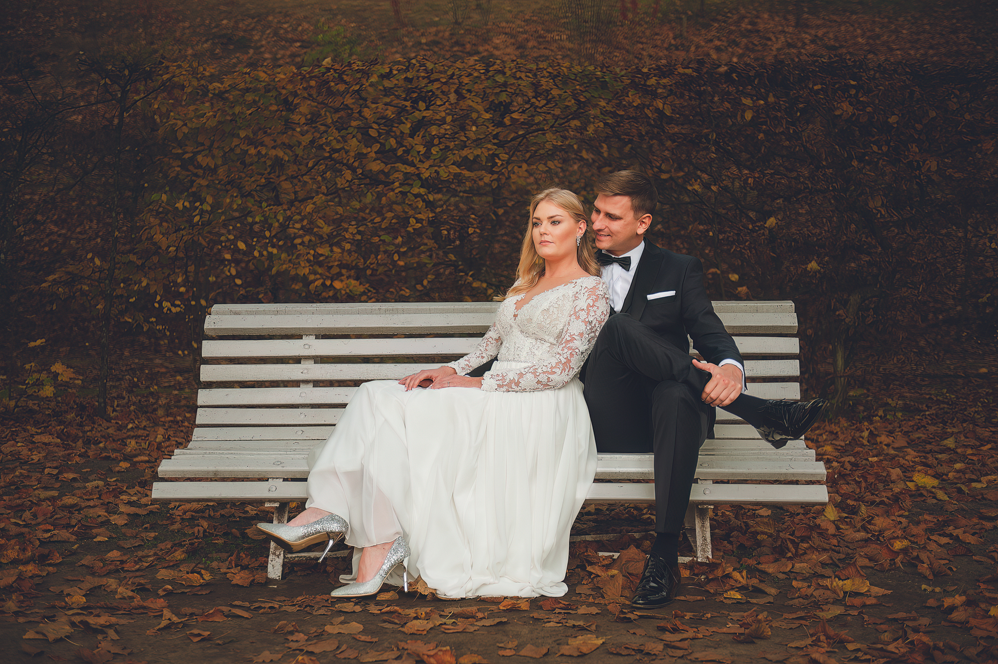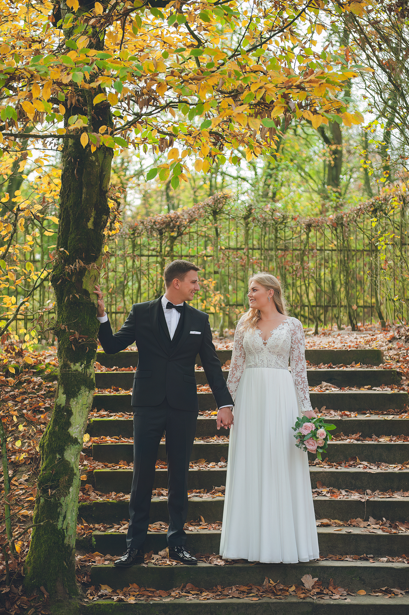 NAPISZ DO NAS →Jesień to najtrudniejsza i najpiękniejsza pora dla fotografa. U Agaty i Michała światło było gęste, złote i nisko zawieszone. Wykorzystaliśmy to, by zbudować klimat "Szlachetnej Ciszy". Ceglane mury kościoła i rudości w parku stworzyły naturalne, ciepłe tło, które idealnie kontrastowało z czernią garnituru i bielą sukni.