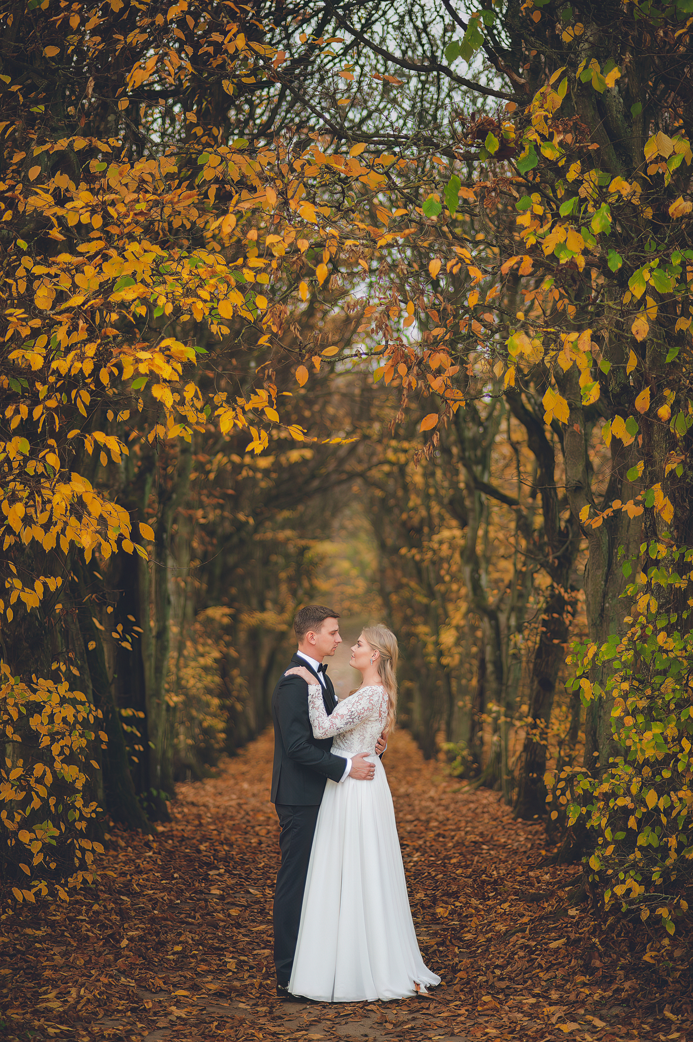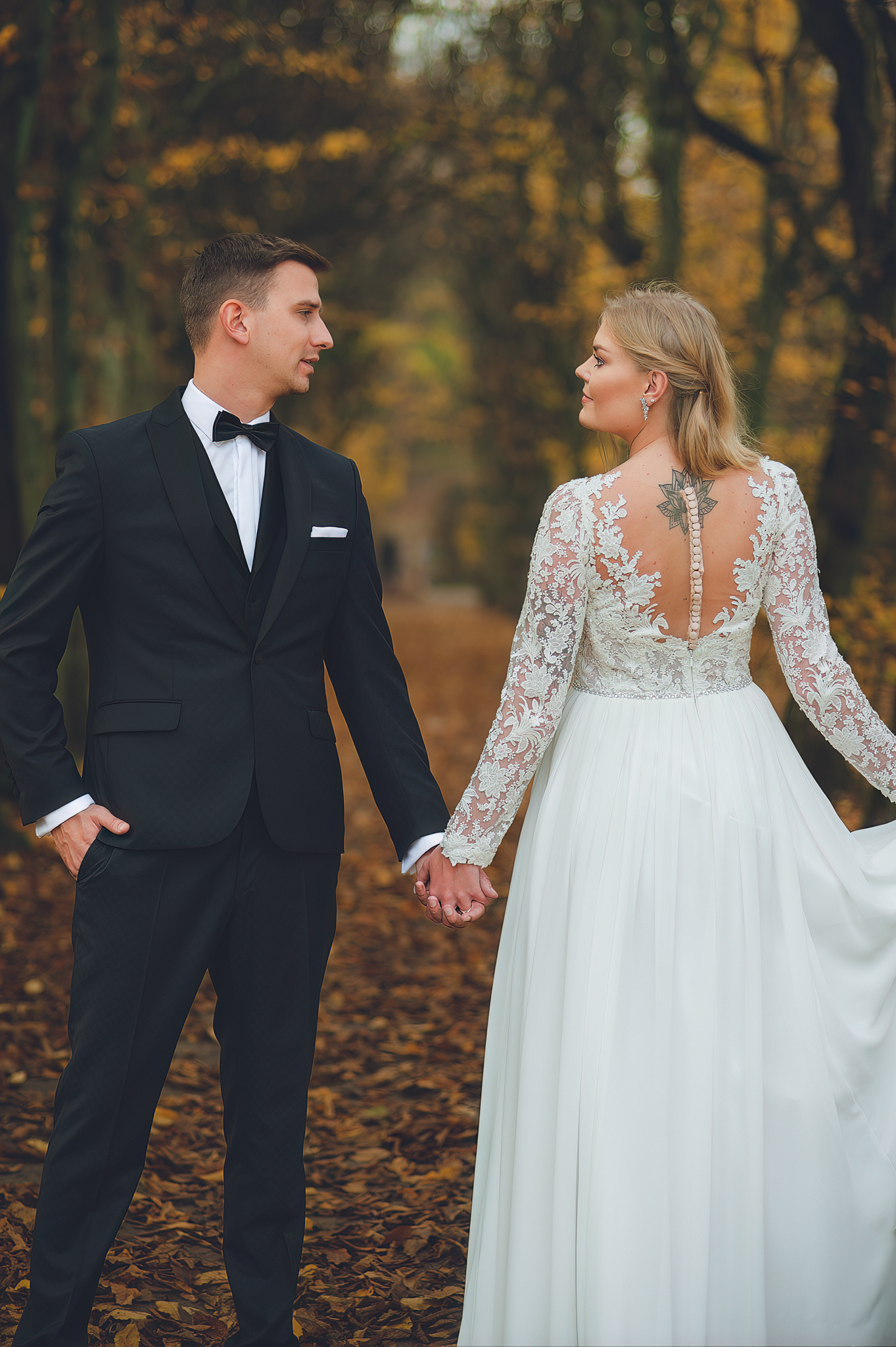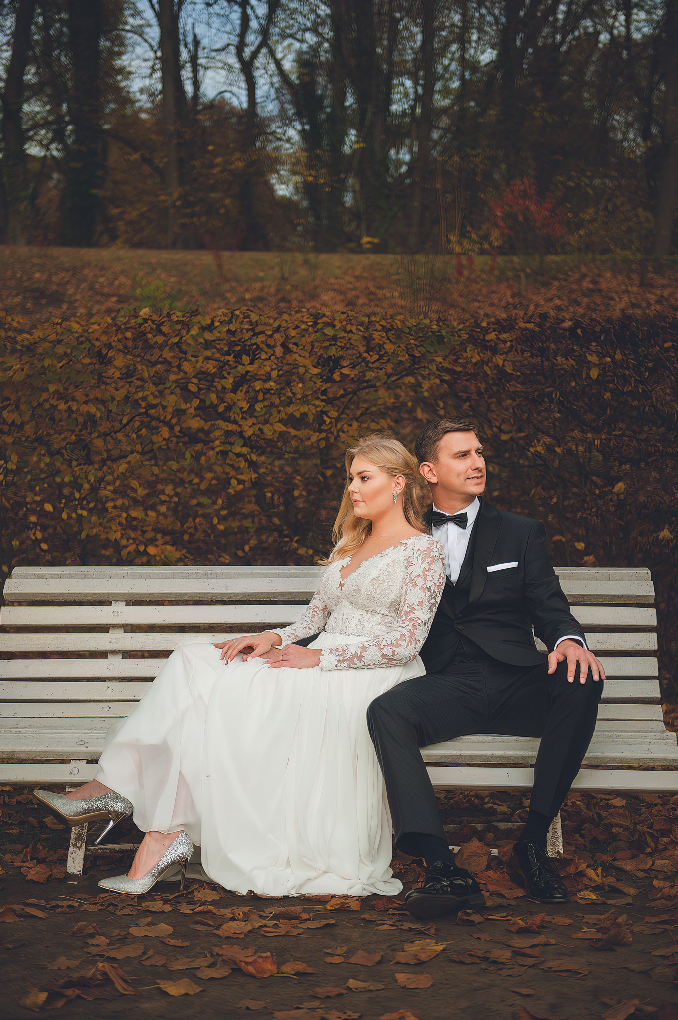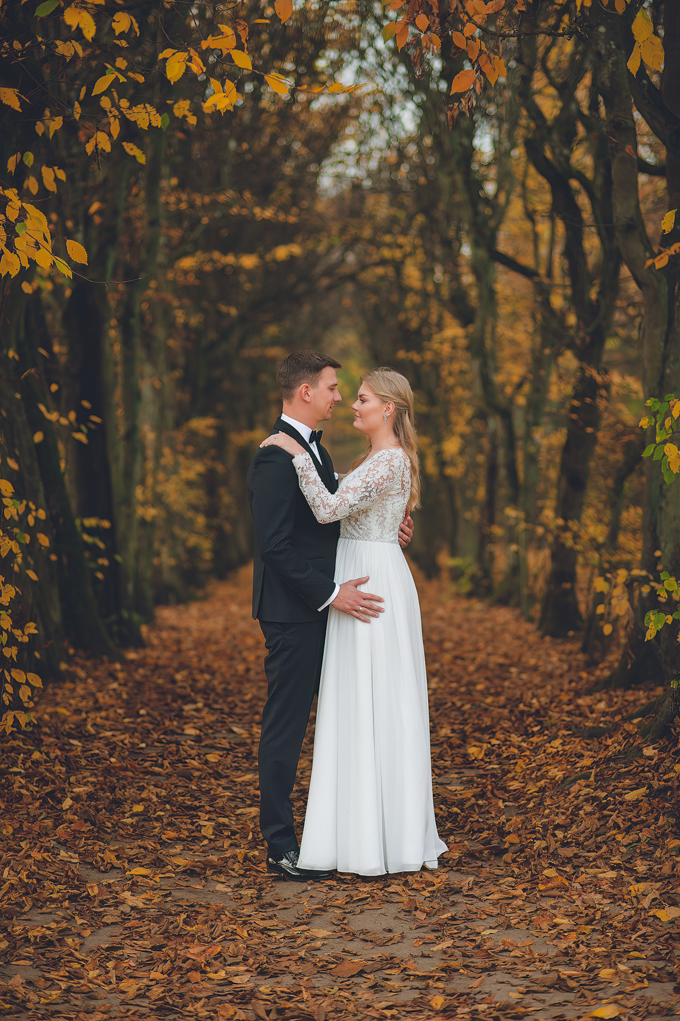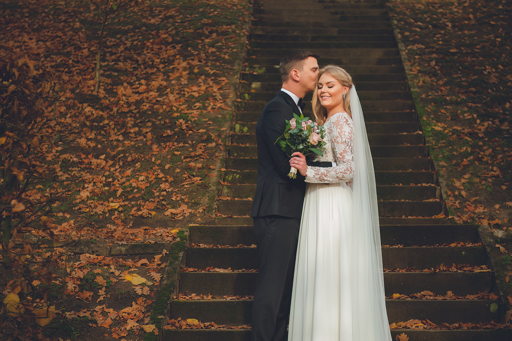 NAPISZ DO NAS →Jesień to najtrudniejsza i najpiękniejsza pora dla fotografa. U Agaty i Michała światło było gęste, złote i nisko zawieszone. Wykorzystaliśmy to, by zbudować klimat "Szlachetnej Ciszy". Ceglane mury kościoła i rudości w parku stworzyły naturalne, ciepłe tło, które idealnie kontrastowało z czernią garnituru i bielą sukni.