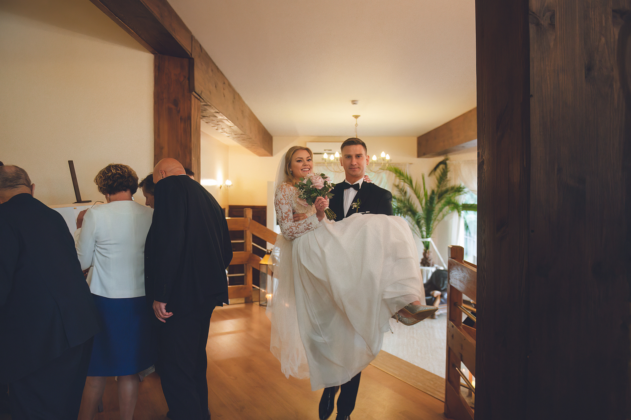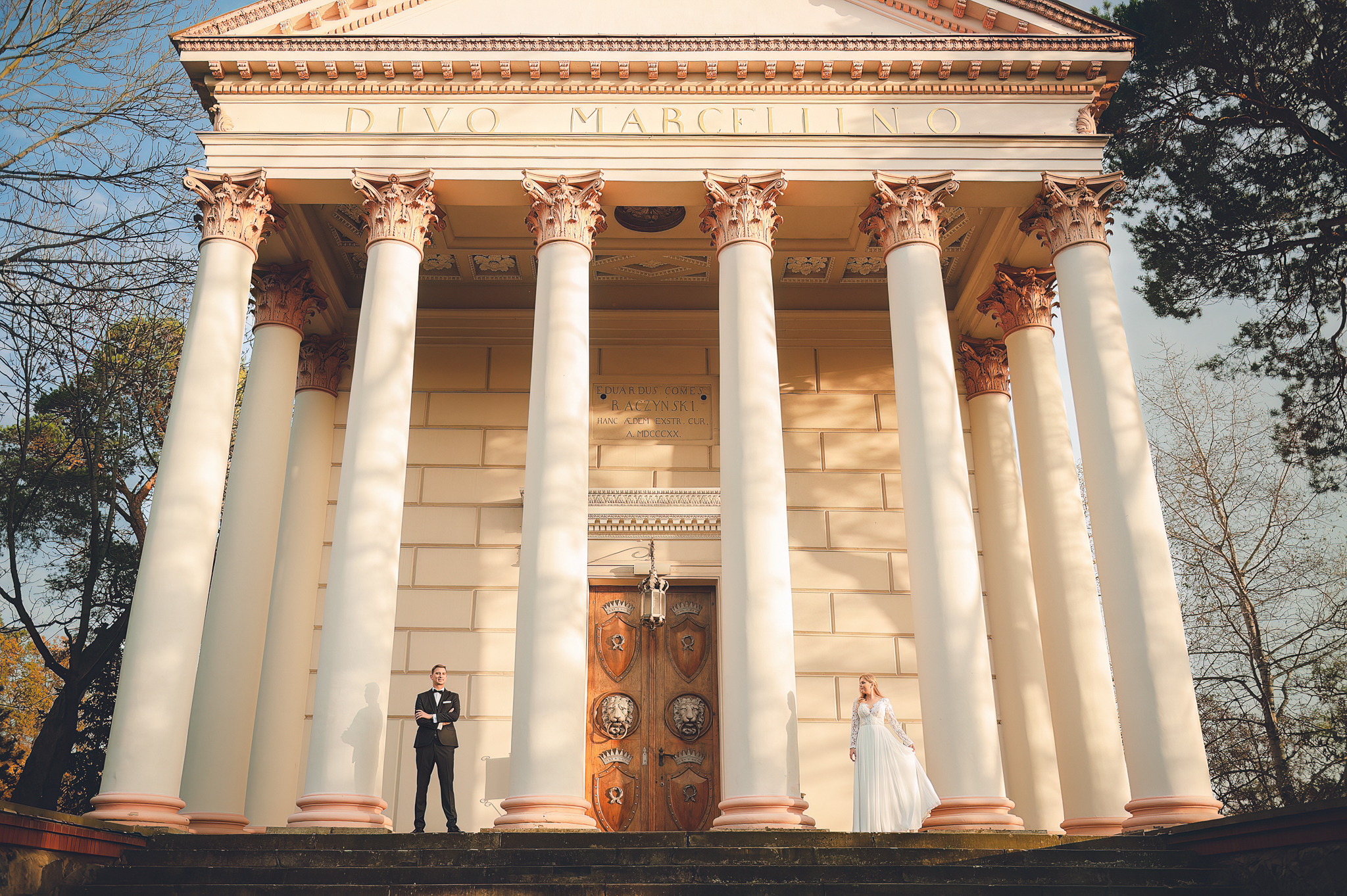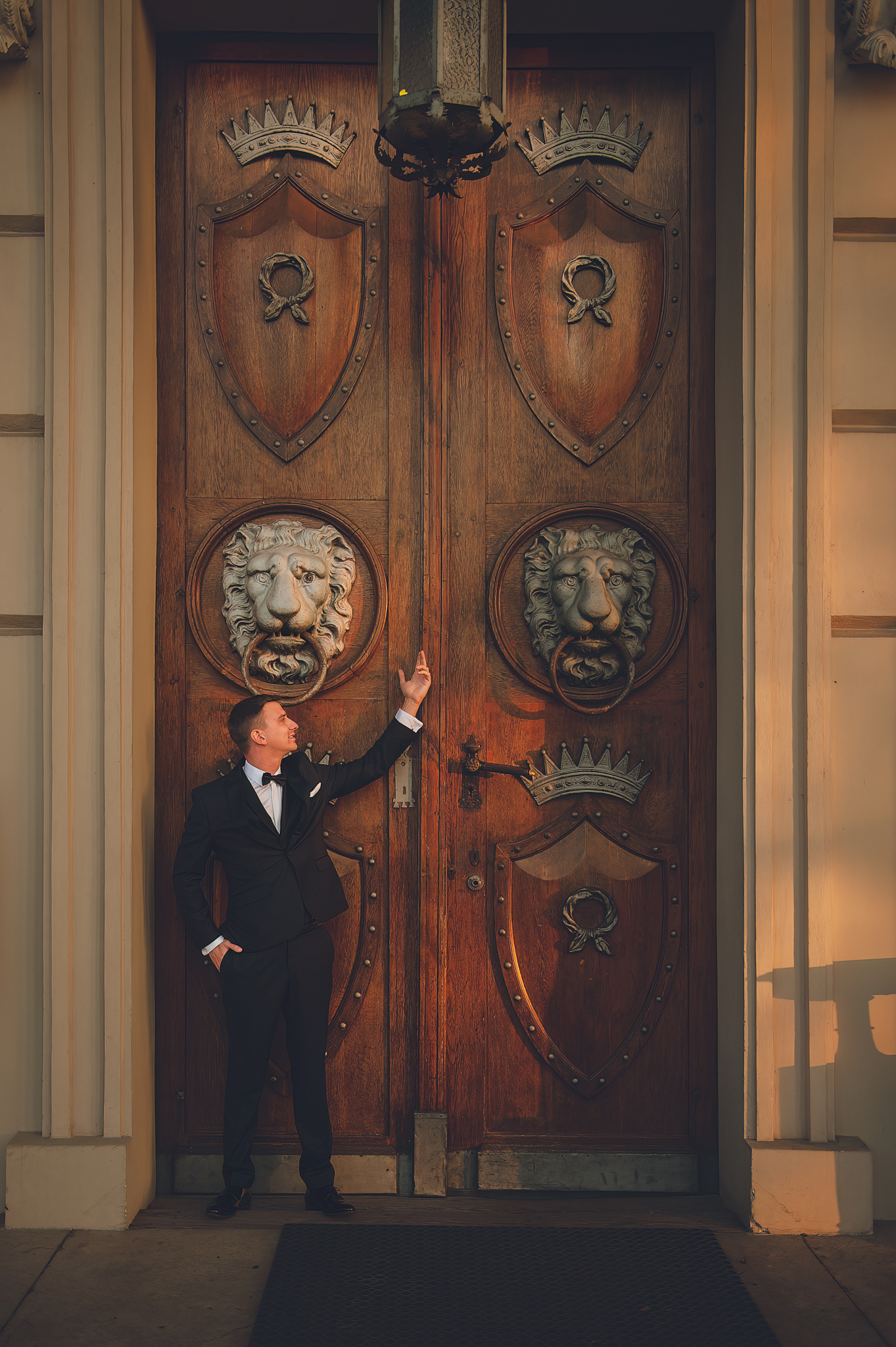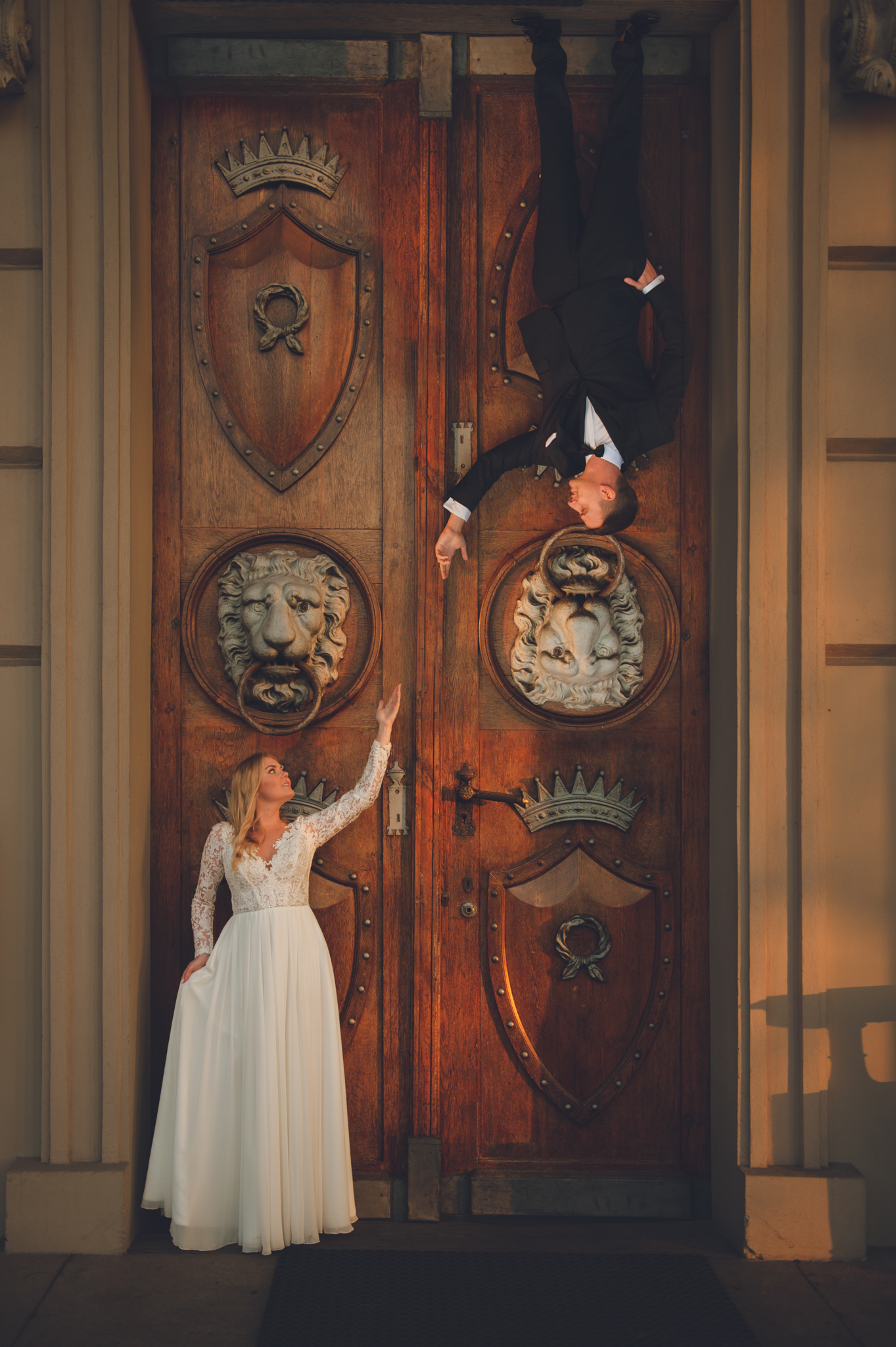 W tym reportażu kluczowa była architektura. Wykorzystaliśmy potężne, drewniane drzwi i pałacowe schody, by nadać zdjęciom majestatu. Agata i Michał wyglądają na nich nie jak para młoda, ale jak para królewska.