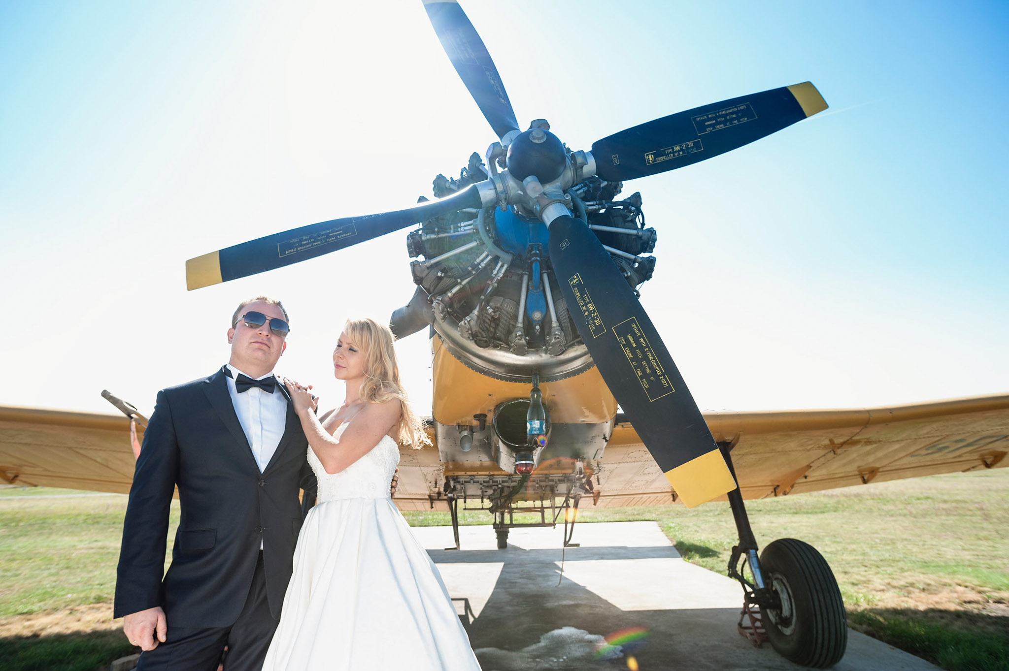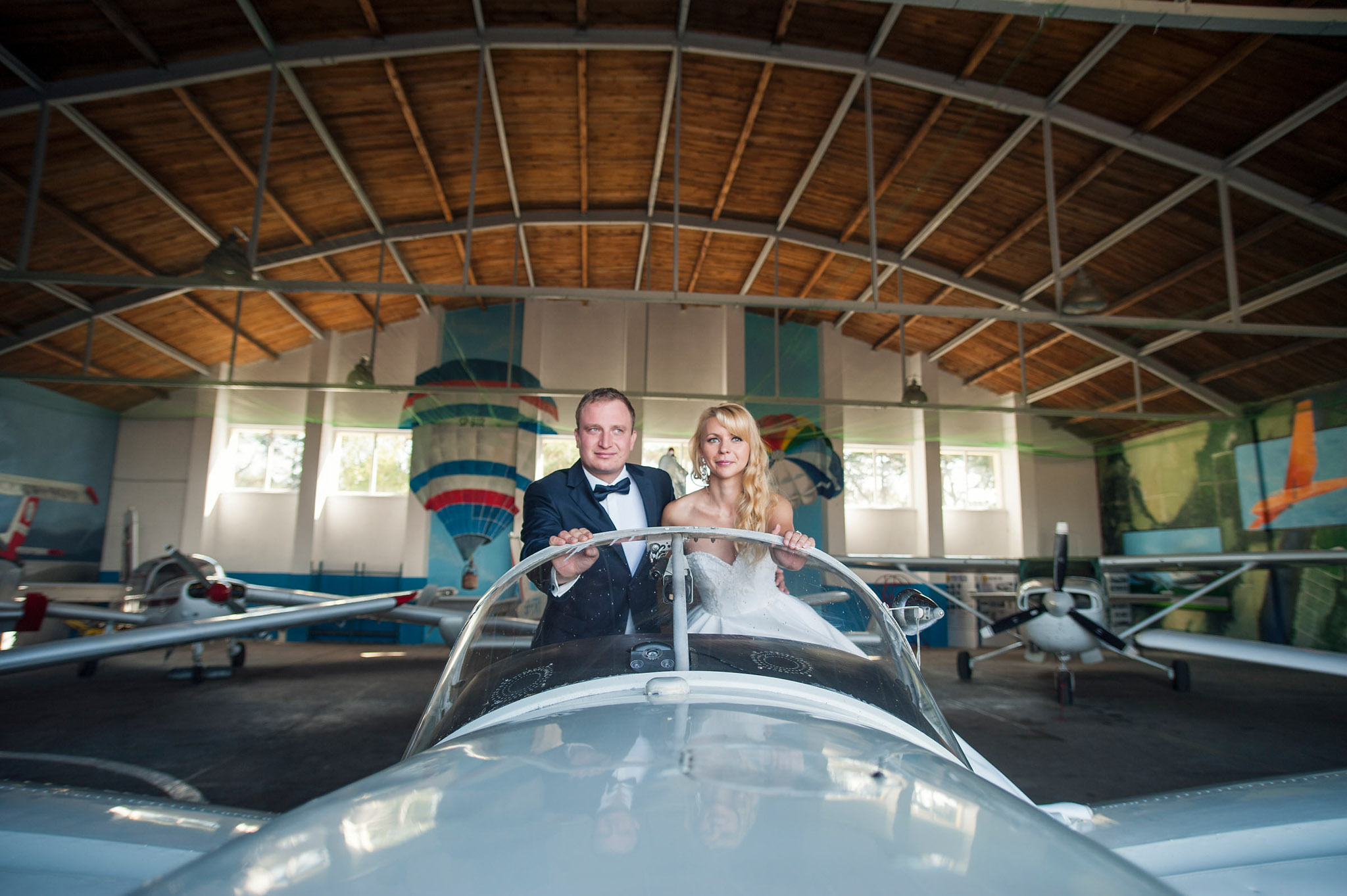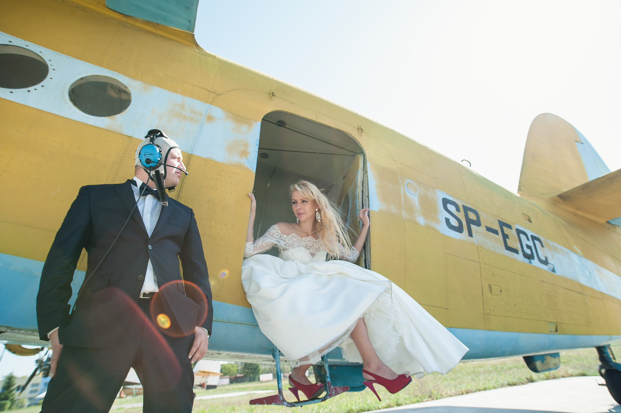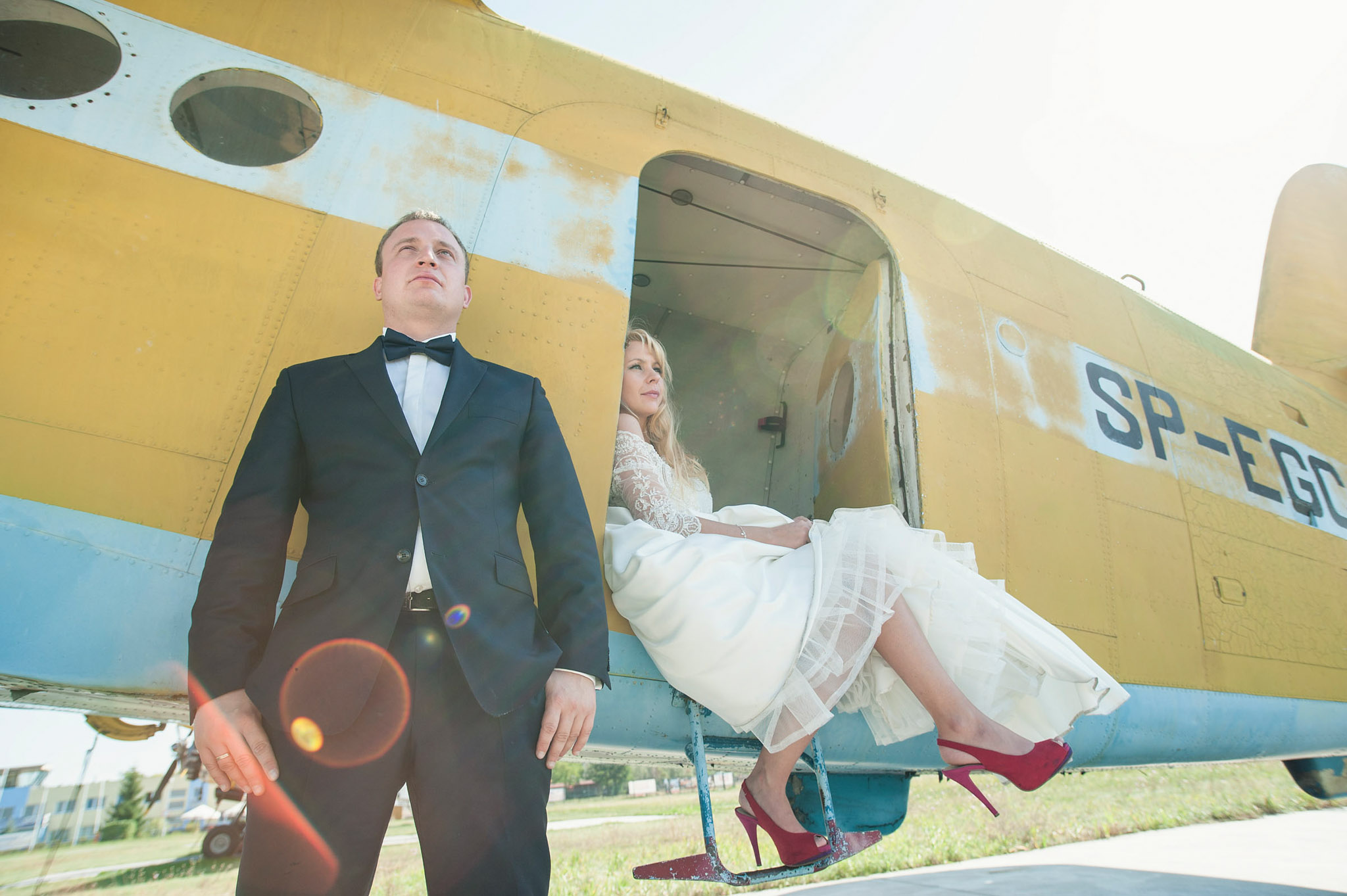 Kluczem do takiej sesji jest kontrast. Garnitur i suknia wieczorowa wyglądają obłędnie na tle brudnego silnika czy surowego betonu hangaru. To styl "James Bond".