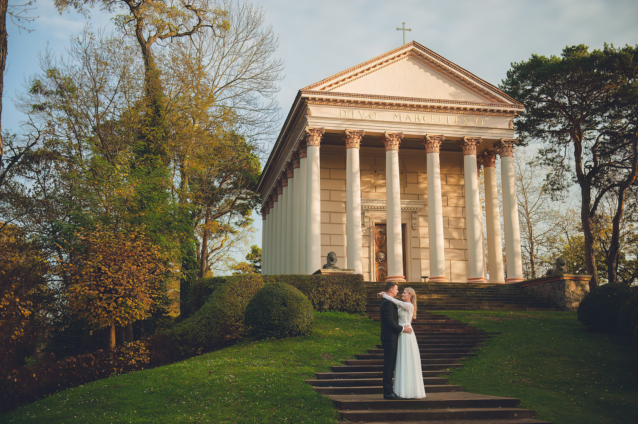 Jego architektura przypomina antyczną świątynię rzymską. Potężne kolumny, wysokie schody i idealna symetria tworzą tło, które przenosi nas w inny wymiar czasu. To wymarzona scenografia dla sesji w stylu "Fine Art" – statycznej, dostojnej, gdzie architektura podkreśla wagę chwili.